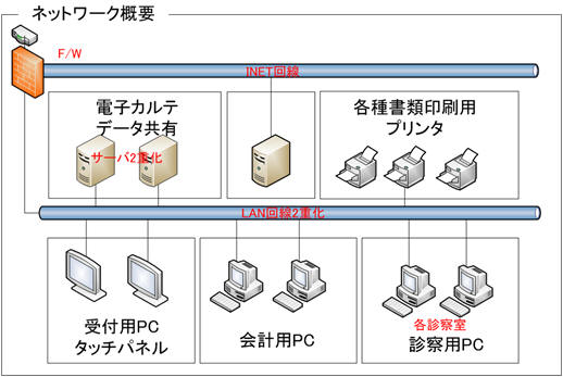 | FW | 概要 | 院内ネットワークとインターネットにFWを介し論理的に外部からのアクセスを遮断。また、院内からインターネットにアクセスを通常遮断し、必要な情報のみをインターネット用サーバから院内のサーバに通信する環境を構築 |